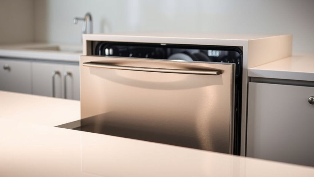 While many dishwasher features are visible and easy to identify, some of the most effective noise-reducing elements are hidden beneath the surface. Look for appliances with soundproof materials that absorb and block noise, preventing sound from escaping. Vibration dampening is also vital; it minimizes movement and rattling during operation. Inside, you might find insulation layers designed specifically to absorb sound waves. Additionally, some models incorporate anti-vibration pads under the dishwasher’s legs, reducing transmission of vibrations to the floor. These hidden features work together to create a quieter environment, ensuring your dishwasher runs smoothly without disturbing your peace. An understanding of contrast ratio can also help you select models with better overall performance, including quieter operation. Keep an eye out for these subtle yet powerful elements when shopping for a silent dishwasher.