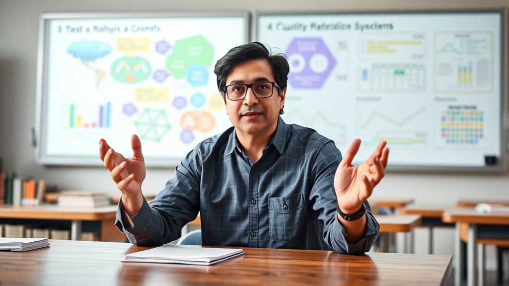 Utilizing visual aids effectively, Sal Khan transforms complex subjects into accessible learning experiences by engaging multiple senses and simplifying abstract concepts. He uses diagrams, animations, and charts to highlight key ideas, making them easier to grasp. These visuals serve as anchors, helping you connect new information with familiar images. Sal carefully selects visuals that clarify rather than clutter, ensuring you stay focused. He also uses color coding to differentiate concepts, making relationships clear at a glance. Additionally, animations break down processes step-by-step, guiding your understanding seamlessly. This strategic use of visuals keeps your attention high and prevents cognitive overload, making even the most challenging topics approachable and memorable.