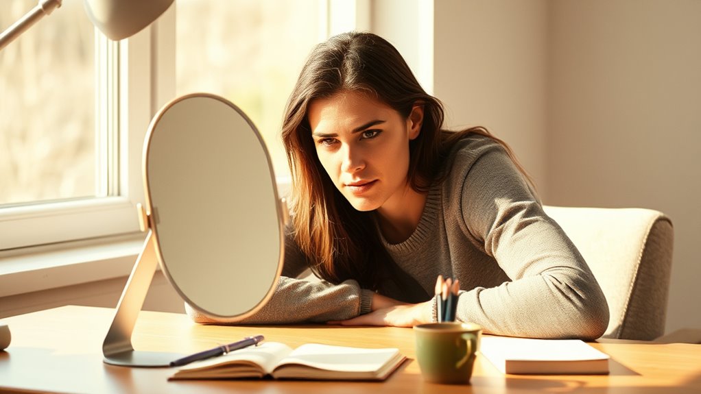 To identify negative self-talk patterns, start with mindfulness awareness—pause and notice your thoughts without judgment. Keep a thought journal to track recurring negative phrases or beliefs. Review your entries regularly to spot patterns and triggers. By staying present and documenting your thoughts, you’ll become more aware of harmful self-talk, making it easier to challenge and reframe those patterns into positive, empowering statements.