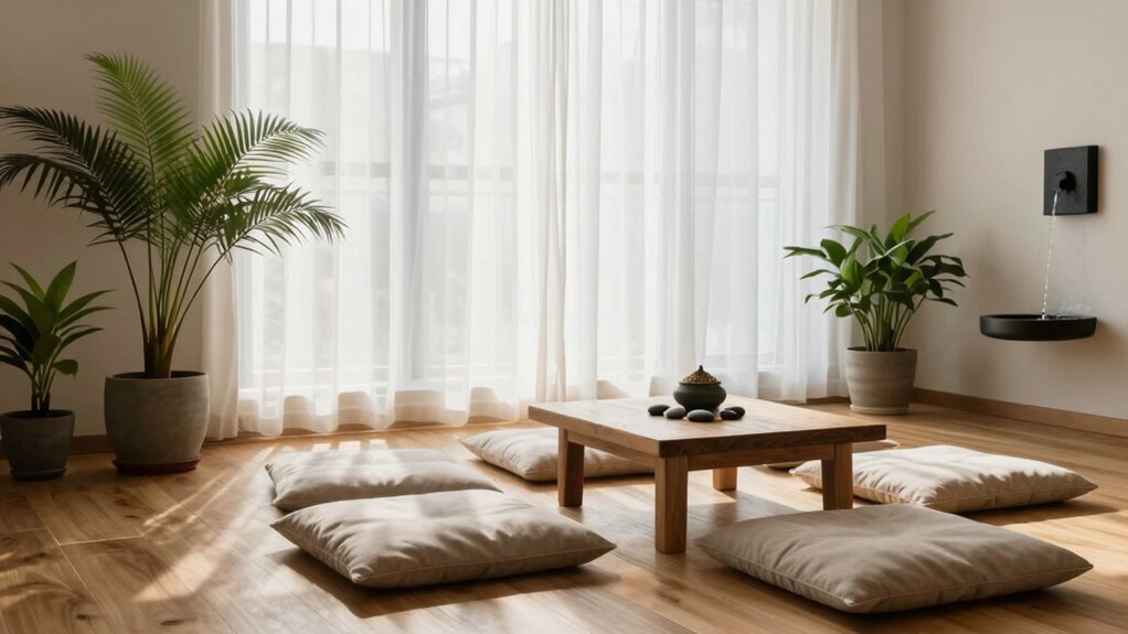 You might think bright reds or vivid yellows energize a space, but in a mindfulness room, calming tones win. Color psychology shows soft blues, gentle greens, and neutral shades promote relaxation and focus. These colors help quiet your mind and reduce stress, turning your space into a true sanctuary. So, skip the flashy hues—embrace calming tones and let your environment soothe your soul.