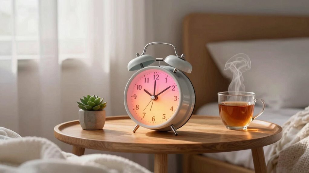 Sunrise alarm clocks utilize light therapy by simulating the sunrise, gradually brightening your room in the minutes leading up to your desired wake-up time. This process influences your circadian rhythm, helping regulate your sleep cycle. When your internal clock receives this natural light cue, it signals to your body that morning has arrived, encouraging a smoother shift from sleep to wakefulness. This kind of light exposure is especially beneficial during darker months or for those who struggle with waking up in the dark, as it helps reset your internal clock and promotes a healthier sleep pattern. Additionally, incorporating landscaping elements that mimic natural environments can enhance the calming effect of morning light exposure. Understanding how light therapy impacts your sleep and mood can empower you to optimize your morning routine and improve overall well-being. Incorporating sleep hygiene practices alongside these clocks can further enhance their benefits, creating a holistic approach to better mornings. Moreover, the design of these clocks often incorporates features that support home design principles, such as unobtrusive placement and aesthetic appeal, making it easier to integrate into your bedroom environment.