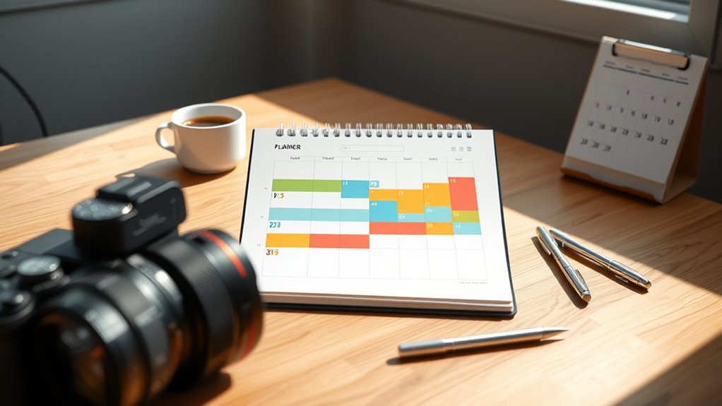 Did you know that it takes about 21 days to form a new habit? To stay consistent with your time blocks, focus on habit formation by setting clear intentions and tracking your progress. Use motivation strategies like rewarding yourself for sticking to your schedule and visualizing your goals. Keep your environment organized and remind yourself of the benefits, turning your time blocking into a natural, automatic part of your daily routine.