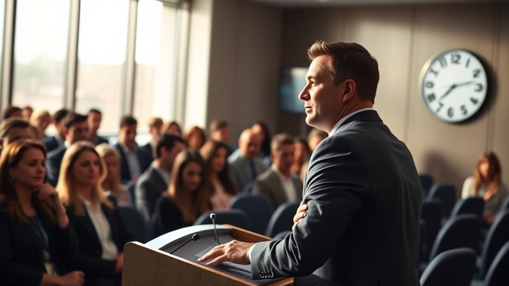 Ever wonder how some speakers instantly grab your attention and hold it throughout their talk? The secret lies in using engaging techniques that create connection and curiosity. Start with a compelling story or surprising fact to pique interest right away. Use vivid language and varied tone to keep your delivery lively. Incorporate rhetorical questions to involve your audience actively. Maintain eye contact and use expressive gestures to build rapport. Break up your speech with short, impactful pauses that emphasize key points. Incorporate visual aids or props when appropriate—they add a layer of interest and clarity. Additionally, understanding how curiosity can enhance problem-solving skills can help you craft more engaging and effective presentations. Cultivating an imaginative mindset enables you to generate innovative ideas that resonate with your audience, making your message even more compelling. Developing a bias to action can also motivate your audience to stay engaged and participate actively during your talk. Paying attention to sustainable strategies ensures your message remains memorable and impactful.